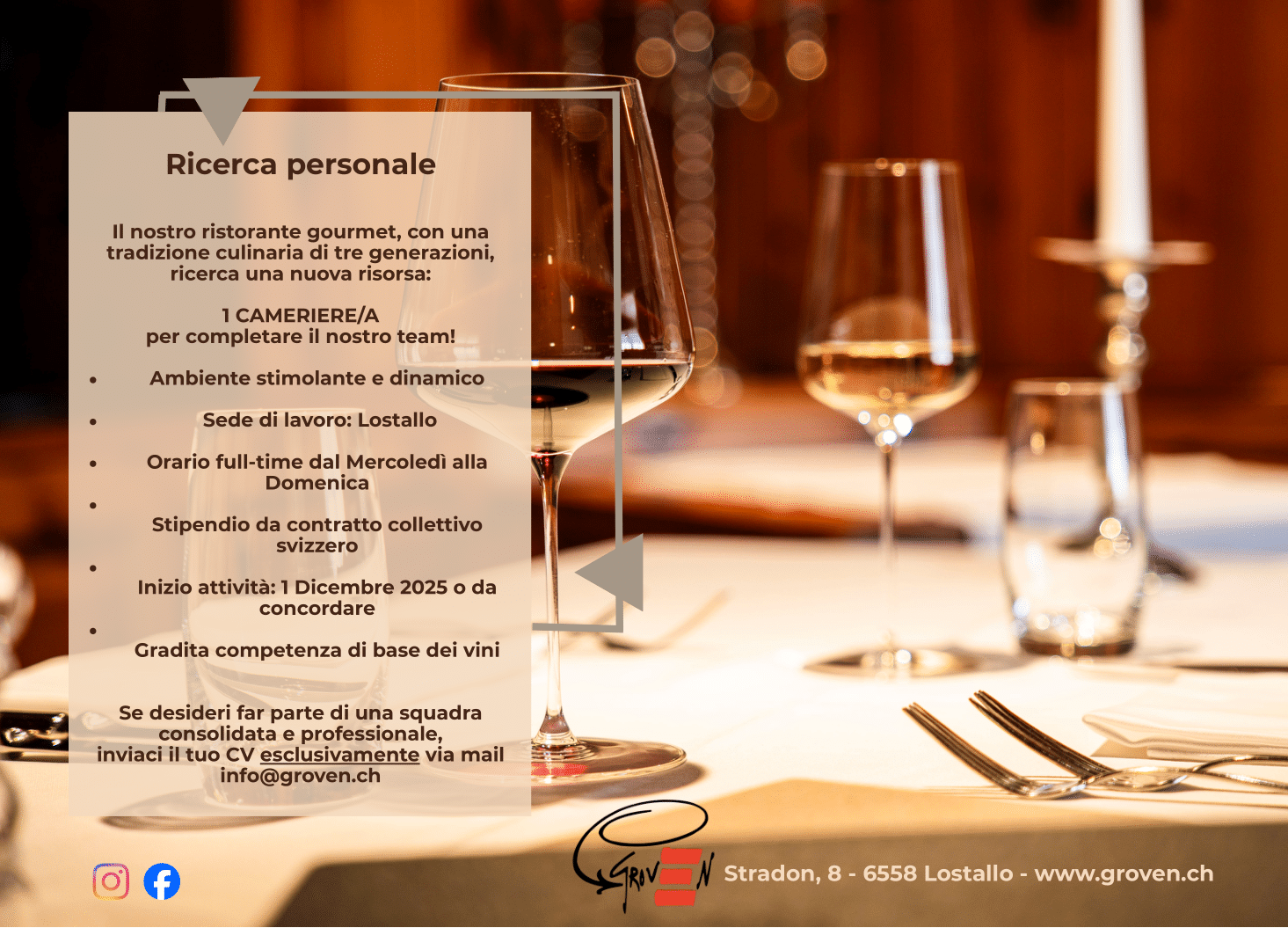 Posizionato a sud del Canton Grigioni, nella Valle Mesolcina, il ristorante Groven offre prelibate specialità, un’ampia scelta di piatti locali, formaggi, selvaggina stagionale e vini ricercati.